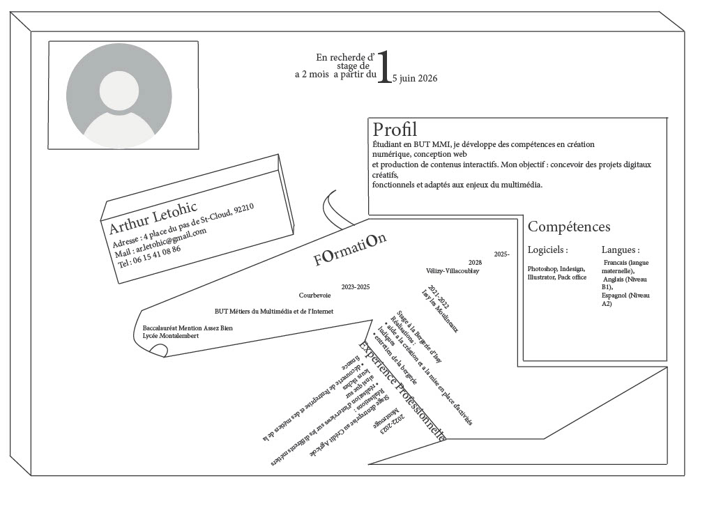 Accueil Arthur Letohic Étudiant en BUT MMI Découvrir mes projets Dernières Réalisations CV Numérique AtypiqueConception et intégration (HTML/CSS) d'un CV au design déstructuré pour repousser les codes classiques. Charte GraphiqueCréation de l'univers visuel complet d'une marque, incluant le logo et la stratégie de positionnement.